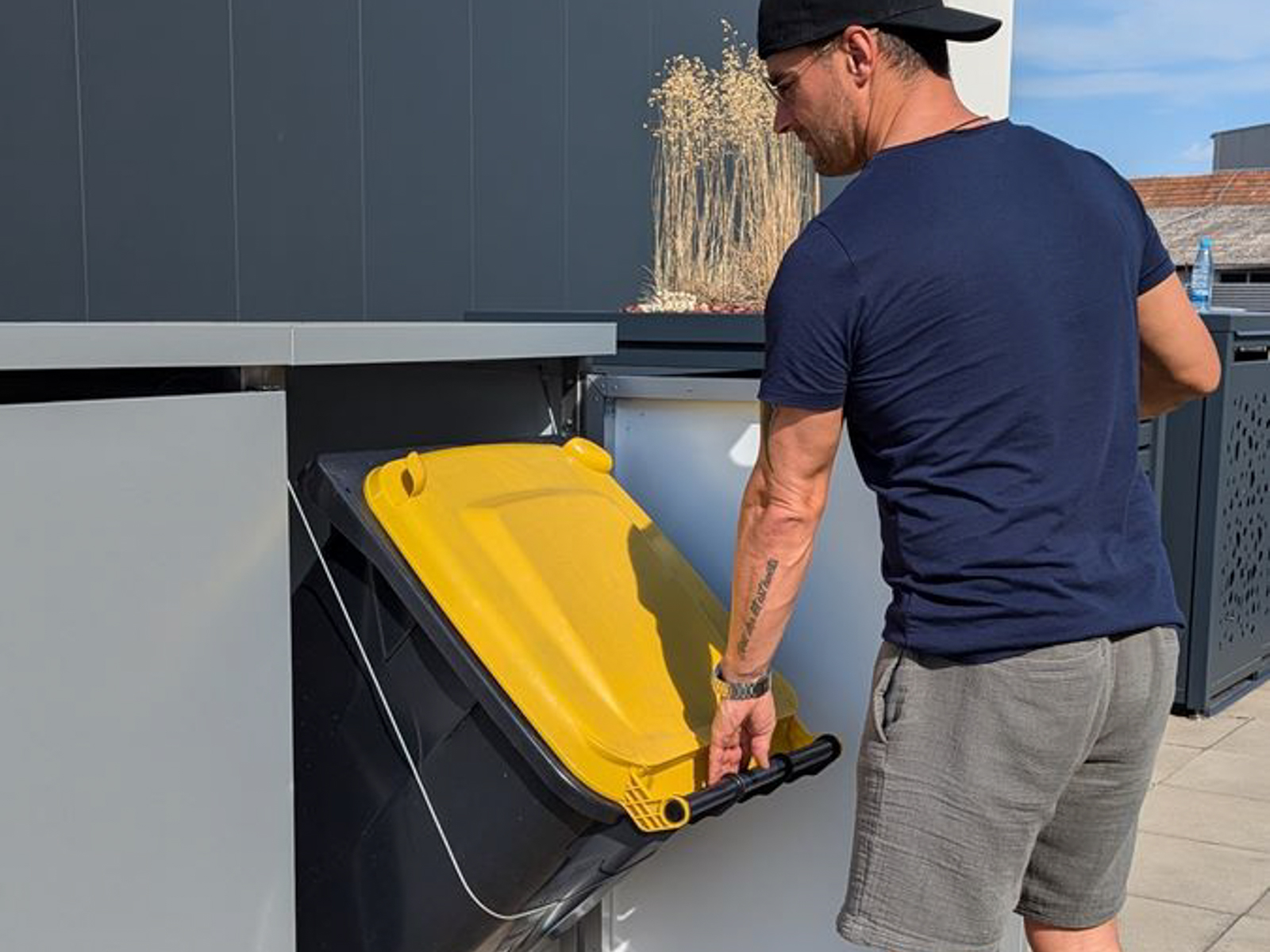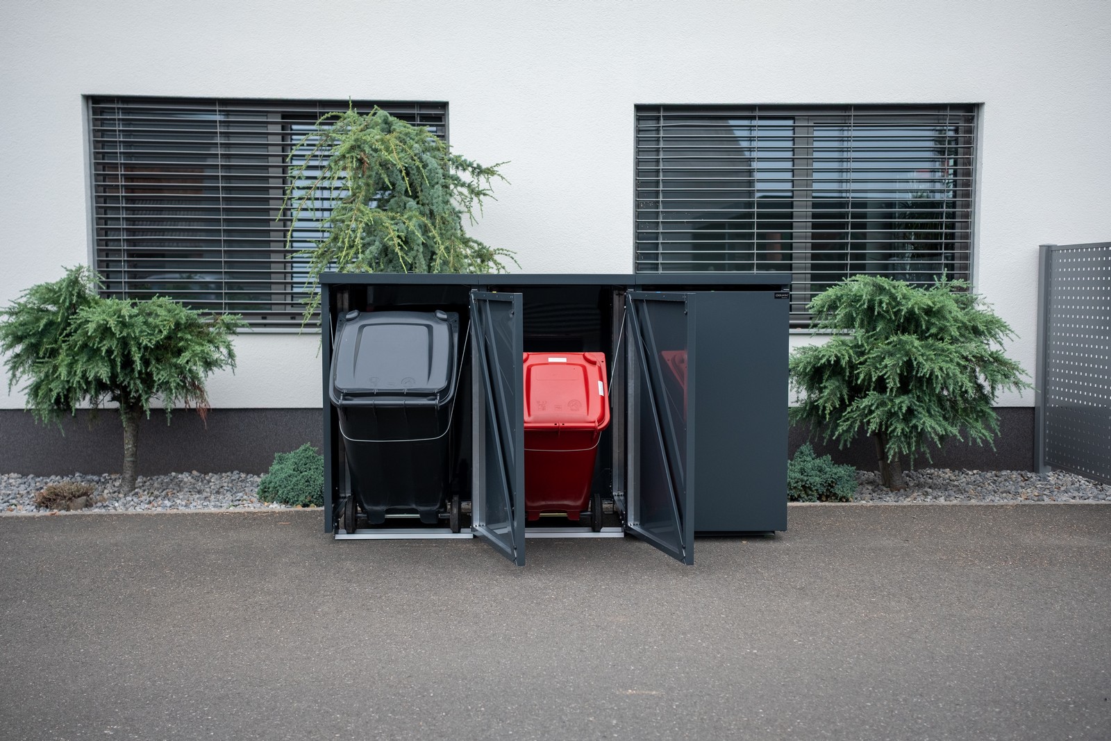 Vam zabojniki kazijo videz okolice? S smetarnikom StyleOUT® BASIC jih diskretno skrijete in hkrati poskrbite za trajno, modularno in elegantno rešitev brez vzdrževanja.